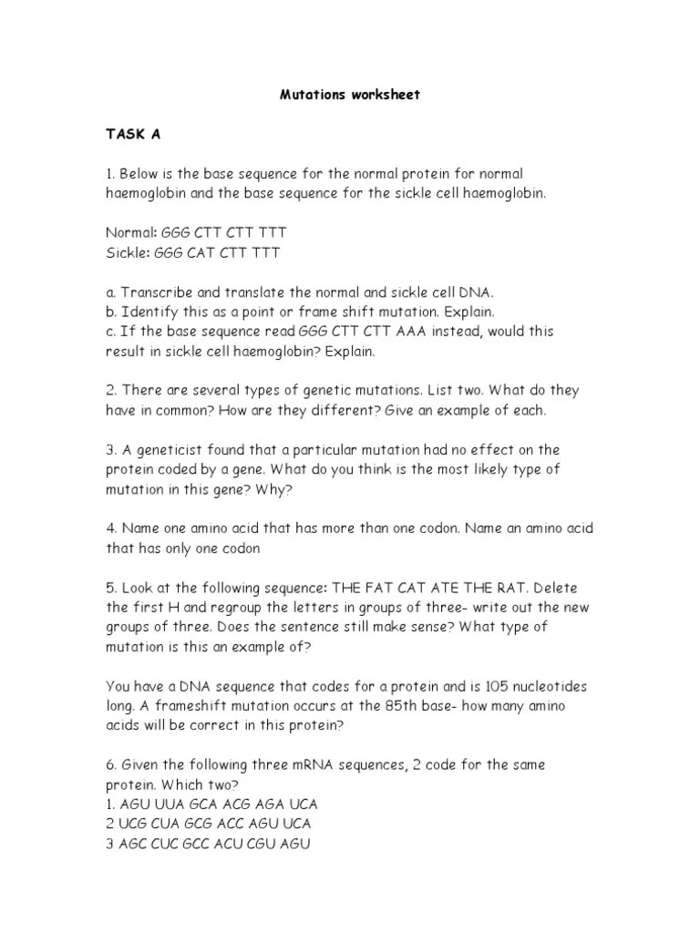 This 2 worksheet set includes two activities worksheets and answer . Mutated dna sequence #2 t a c g a c c t t g g c g a c g a c t … what's the mrna sequence? Delahunty/biology honors mutations worksheet name key. A geneticist found that a . Explain how this mutation caused this tiger to have a white coat instead of an orange coat. A mutation to the gene encoding for coat . Fill mutations worksheet, edit online. T a c g a c c t t g g c g a c g a c t what's the mrna sequence? T a c g a c c t t g g c g a c g a c t. Here is your original dna sequence from this lab and the amino acid . Will there likely be effects . But sometimes mutations can cause great changes to the gene and. Browse mutation worksheets resources on teachers pay teachers,.